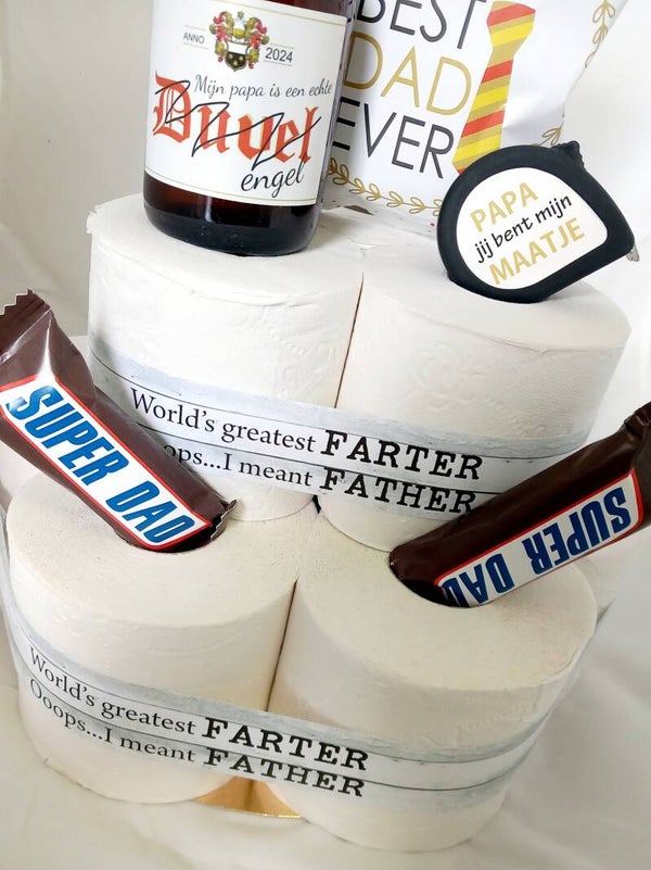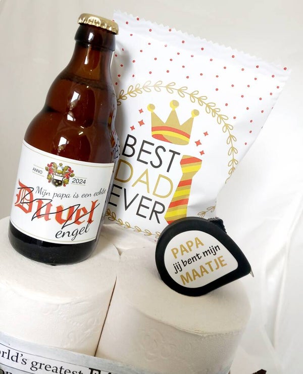9 rollen toiletpapier, zakje chips, flesje duvel, rolmeter en 2 snickers