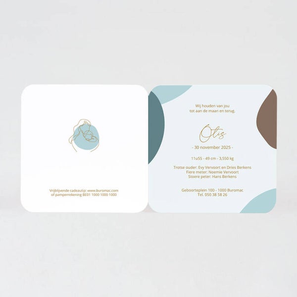 Eigenschappen: Op zoek naar een hip geboortekaartje met een bijzondere afwerking? Dit abstract geboortekaartje lijntekening mama met baby in blauwtinten en goudfolie is perfect om de geboorte van jouw zoontje aan te kondigen. De fonkelende goudfolie geeft jouw kaartje die extra touch! Zo staat jullie lieve kleine jongen gelijk in de schijnwerpers!