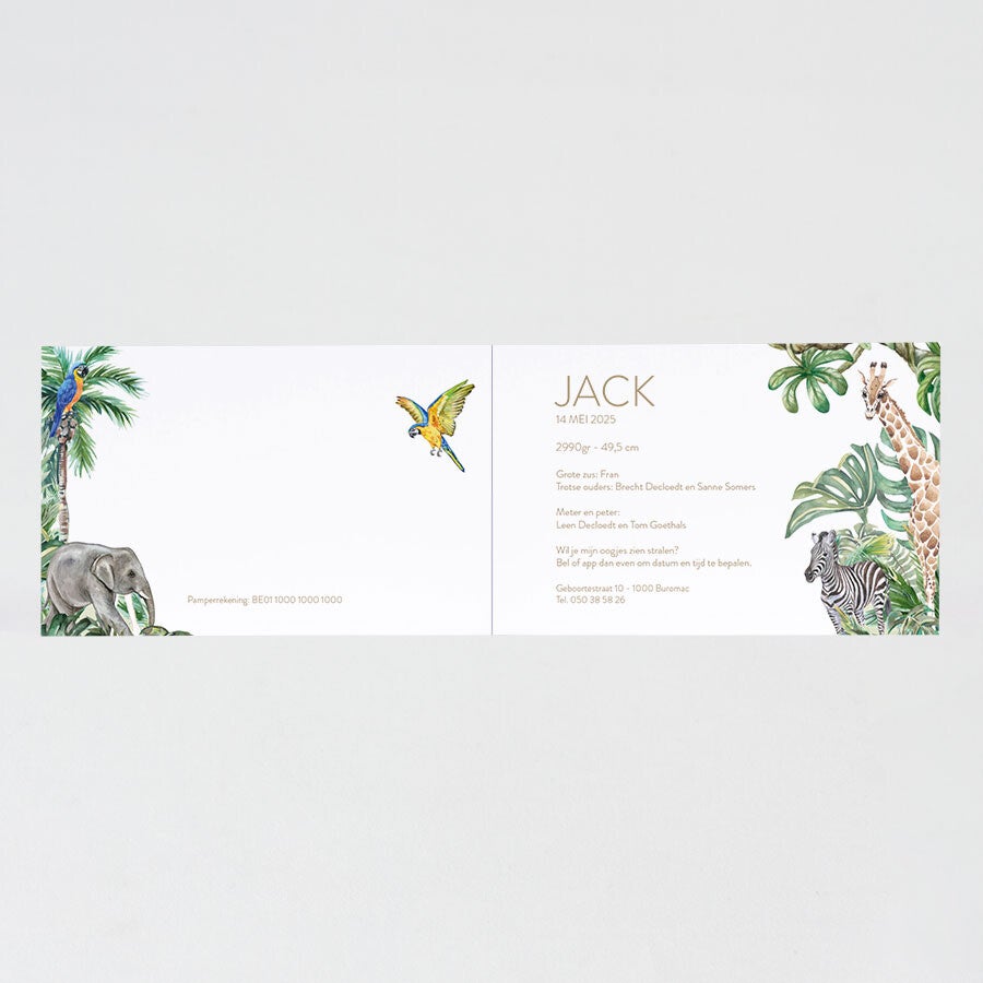 Formaat: 170 x 110 mmPapiertype: Wit luxe papierEigenschappen: Dit hippe geboortekaartje met vrolijke jungledieren in felle kleurtjes is dé manier om de geboorte van jullie wonder aan vrienden en familie kenbaar te maken.