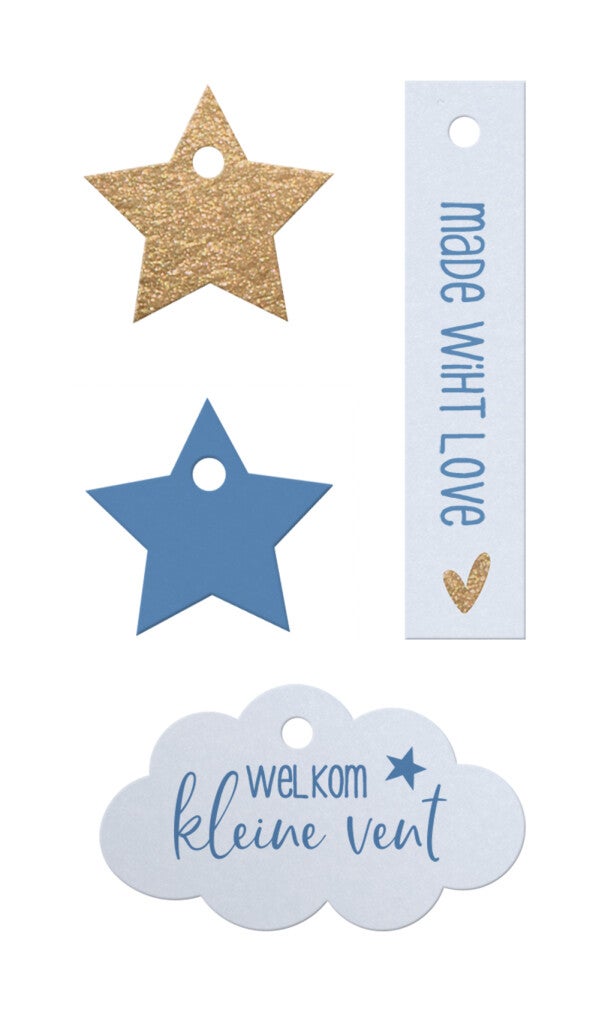 Dit kaartje is gedrukt op parelwit metallic papier met labels en goudfolie sterretjes en een mooi naturel/goud koordje.