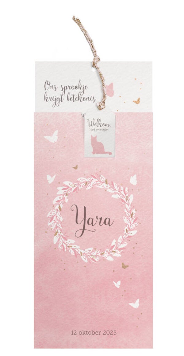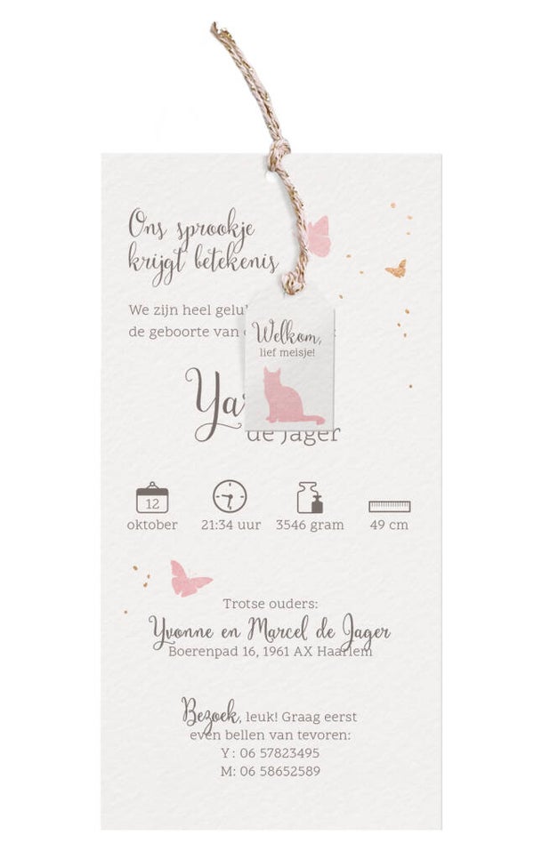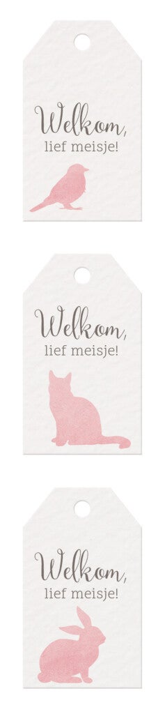 Babykaartje van aquarelpapier met extra labels, een koordje van roze met goud zorgt voor een mooie combinatie. De extra meegeleverde labels zijn bedrukt met een kat, konijn en vogel.
