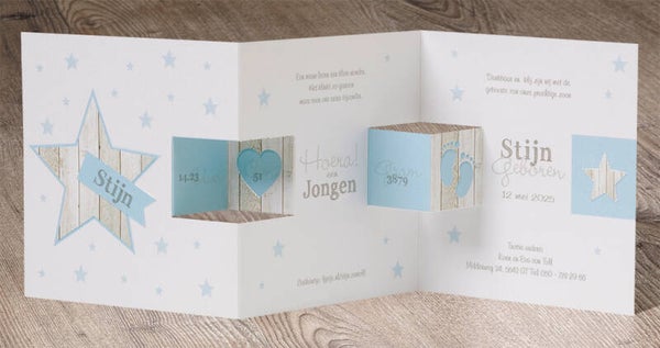 Lief geboortekaartje voor een jongen met speelse sterren patroon en hout