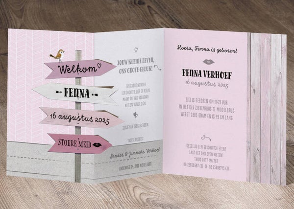 Stoer meisjes geboortekaartje met houten bordjes als welkom voor jullie dochter