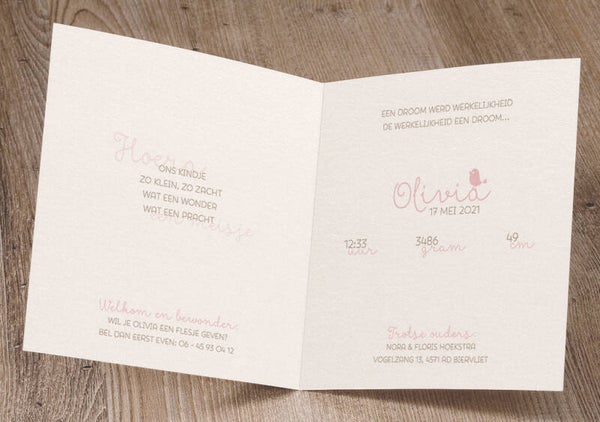 Schattig geboortekaartje met een hartvormig stansgat omringd door bloemen en lief vogeltje.