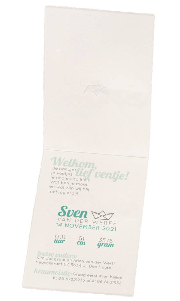 Hip geboortekaartje met zilveren origami bootje met reliëf op de voorzijde.
