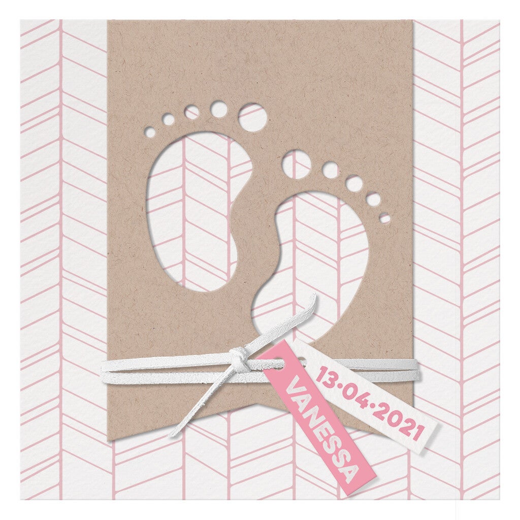 Modern geboortekaartje met uitgesneden voetjes in kraft papier