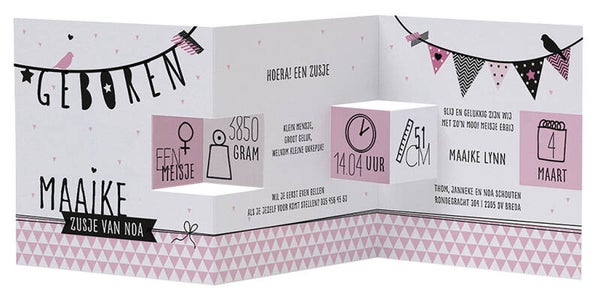 Speelse uitvouwkaart op luxe metallic papier om de geboorte van jullie kindje op een hippe manier aan te kondigen.