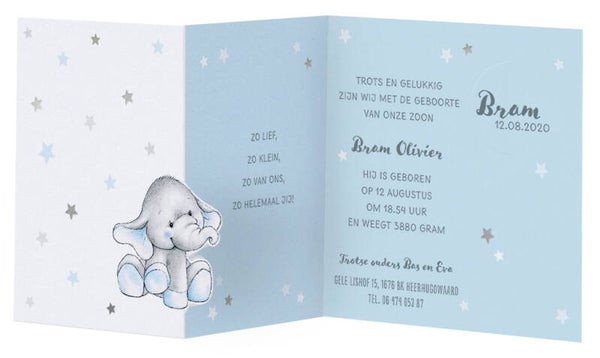 Liefelijk geboortekaartje met geïllustreerd olifantje op luxe metallic papier en afgewerkt met zilverfolie sterretjes.
