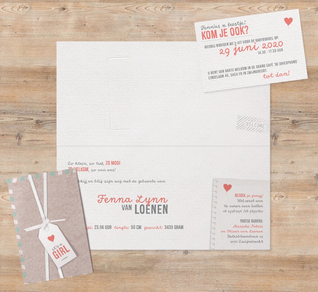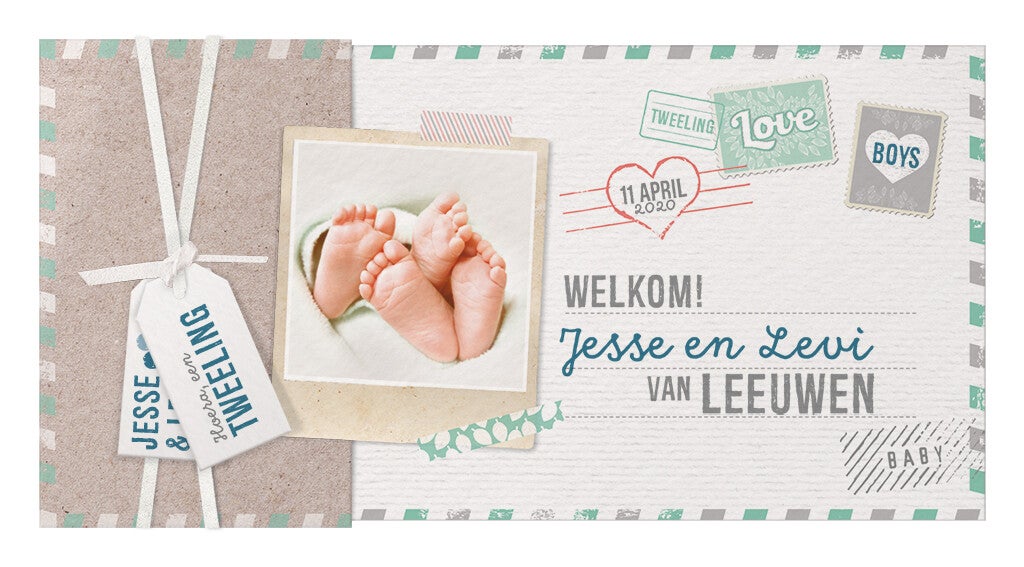 Verras jullie gasten met babypost met deze hippe aankondiging voorzien van vele leuke details. Binnenin insteekje voor extra kaartje. Voor het mooiste resultaat raden wij aan om de foto apart te laten drukken.