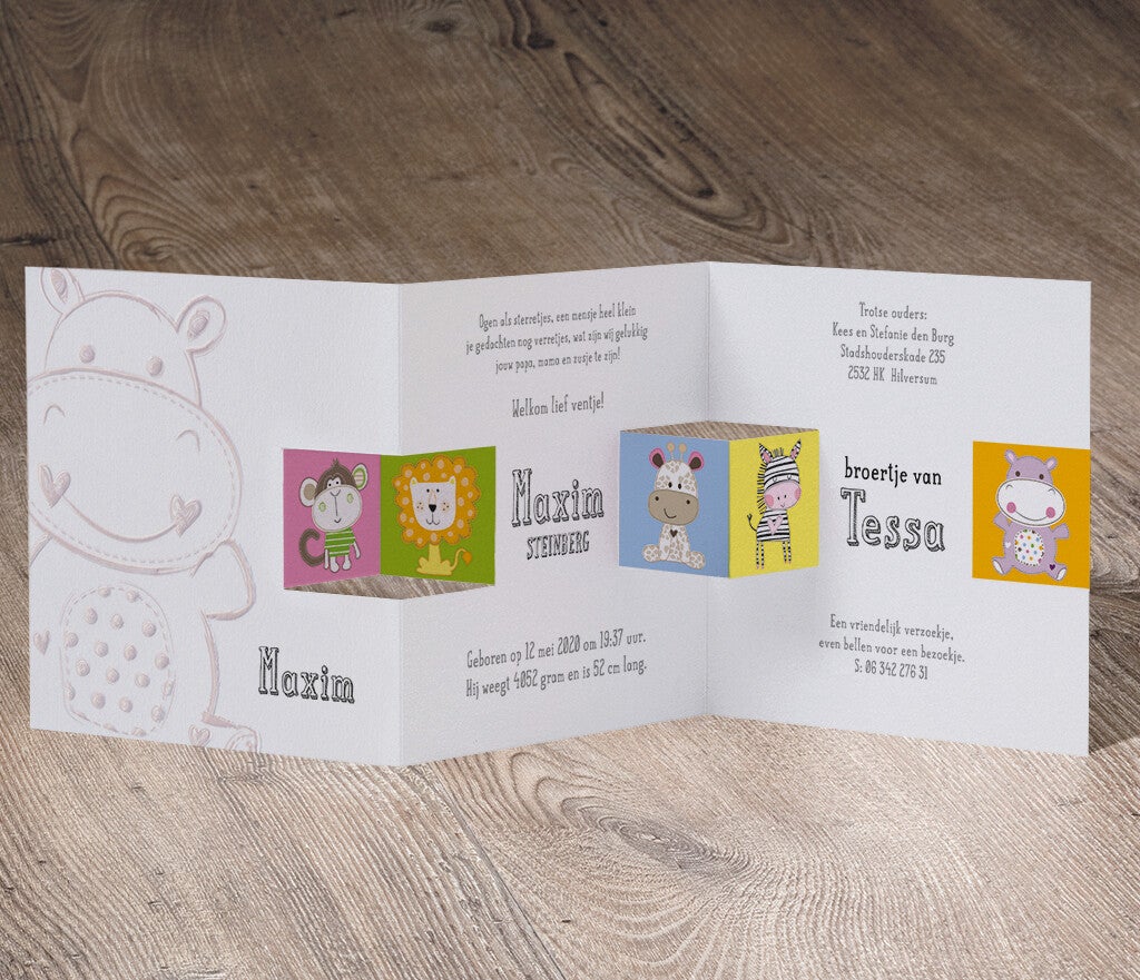 Leuk geboortekaartje met lieve diertjes
