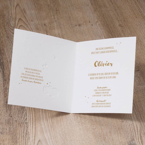Lief geboortekaartje op parelmoer papier met goudaccenten