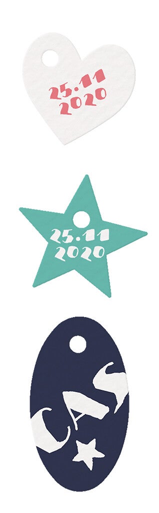 Labelkaart met uitgesneden silhouet en kleine labeltjes
