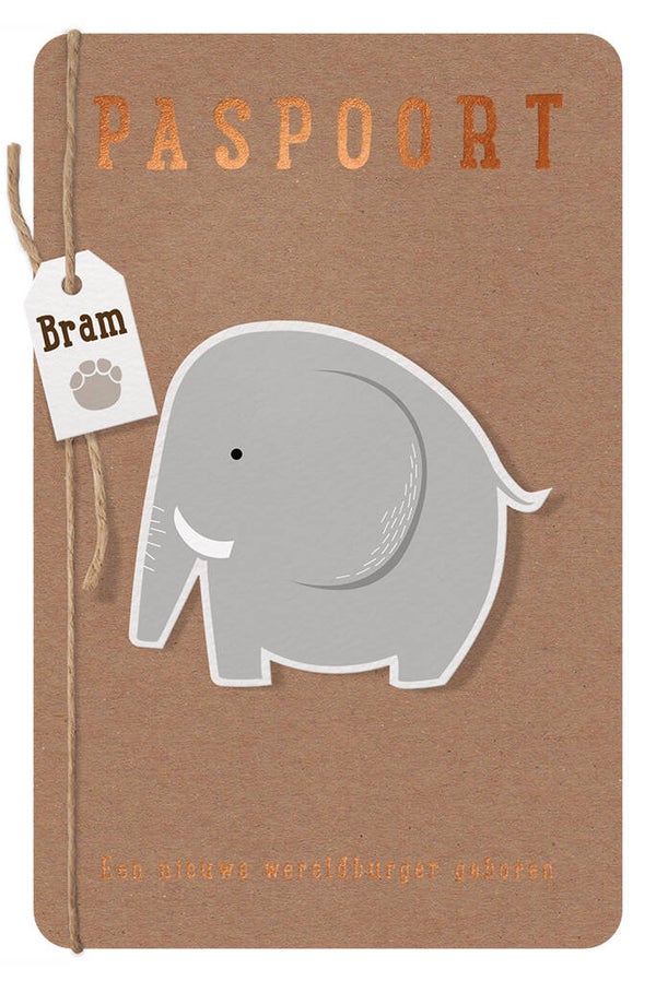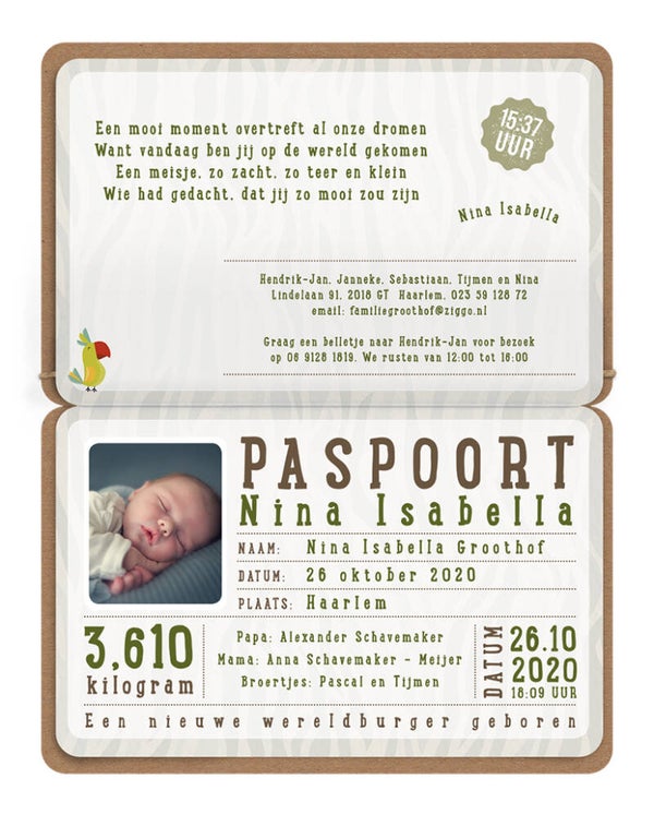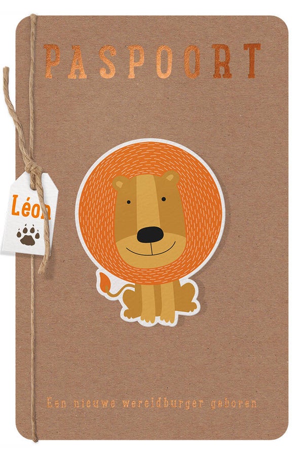 Grappig paspoort in kraftpapier met keuze uit 3 lieve diertjes en ruimte voor een foto van jullie kindje.