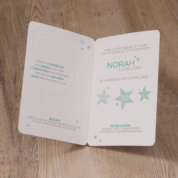 Dit kaartje op structuurpapier met reliëf en gouden sterretjes vertelt in een oogopslag hoe gelukkig jullie zijn met dit kleine wondertje.