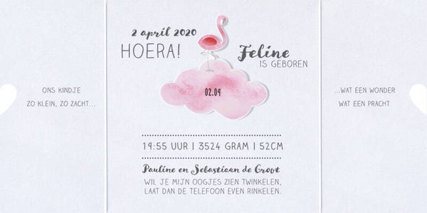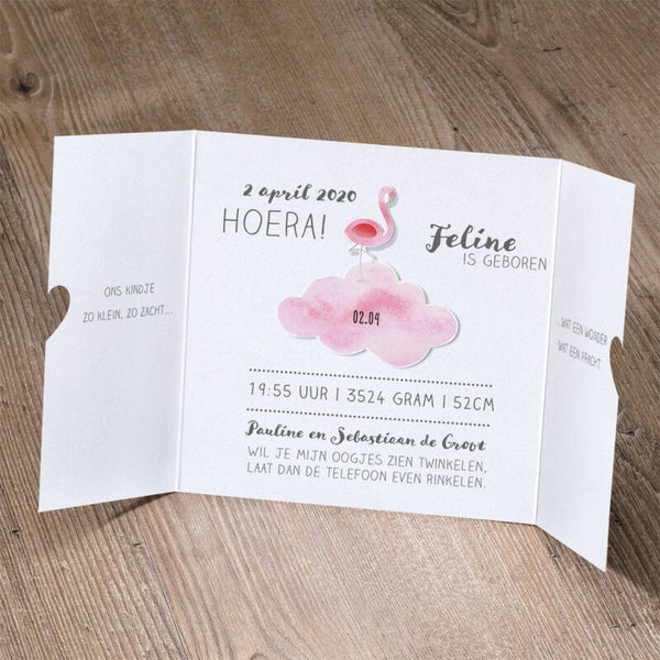 Pink flamingo's, helemaal hot! Met deze kaart op parelmoerpapier kondig je op een trendy manier de geboorte van jullie kindje aan.