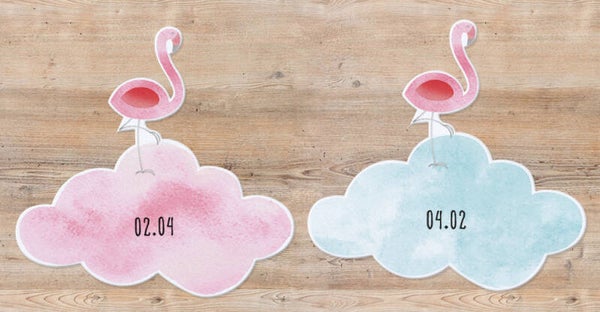 Hip geboortekaartje met sierlijke flamingo's en uitgesneden hartje