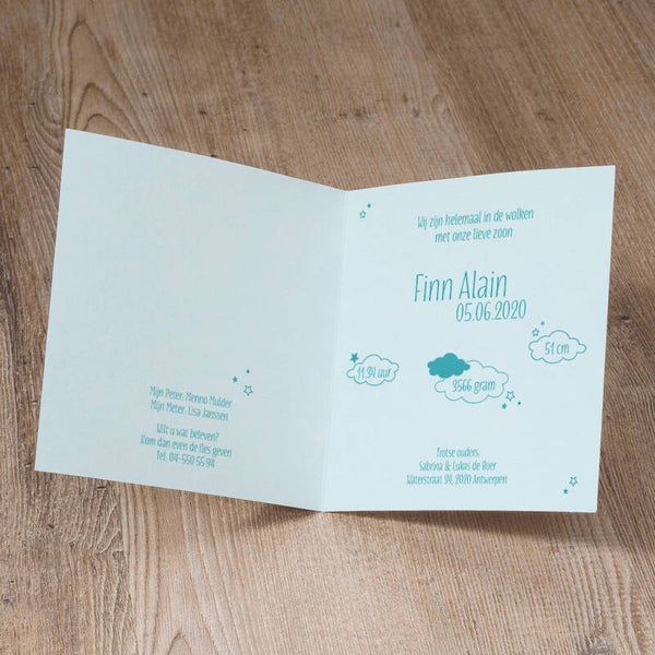 Lief geboortekaartje met ooievaar in suède inkt en uitgesneden hartje en wolkje