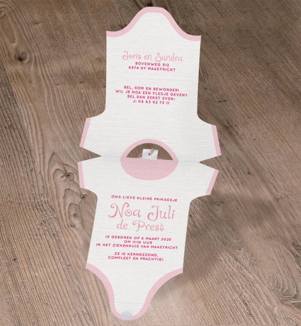 Super origineel geboortekaartje in vorm van een rompertje met klittenbandsluiting en gekleurd touwtje.