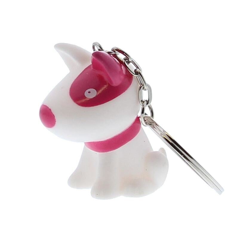Fuchsia hondje uit kunststof als sleutelhanger.