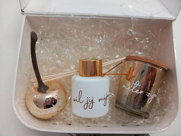 Koffertje gevuld met kersje, geurpotje en kaarsje