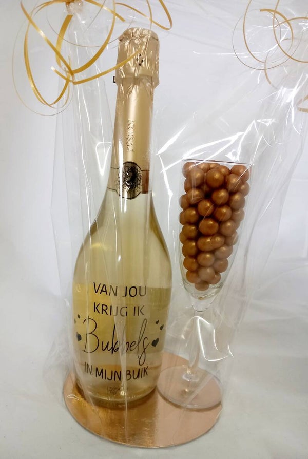 Glittercava "van jou krijg ik bubbels in mijn buik" + glas gevuld met chocochoups