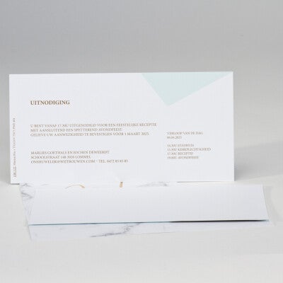 Eigenschappen: Elegante langwerpige trouwkaart in marmerlook met schuin afgesneden pochette. Binnenin de pochette zitten nog 2 afzonderlijke kaarten met details in munt en goud. De JA in goudfolie aan de voorzijde zorgt voor een meer dan ge